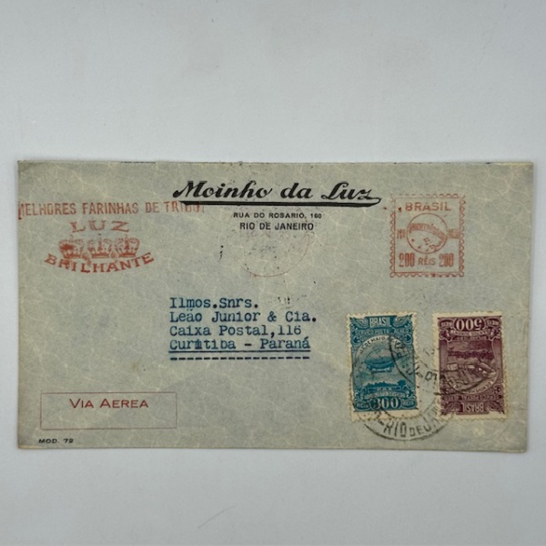 • Envelope Carimbo Maquina 200 réis. Mais 800 réis selos aéreos, carombo publicitário `melhores fatinhas de trigo Luz Brilhante`. Sindicato condor IXV