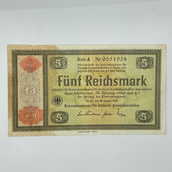 • Cédula 5 marcos do Reich, 1934. Fundo de conversão para dividas externas alemãs. Pick 207. SOB/FE. Belíssima no aspecto