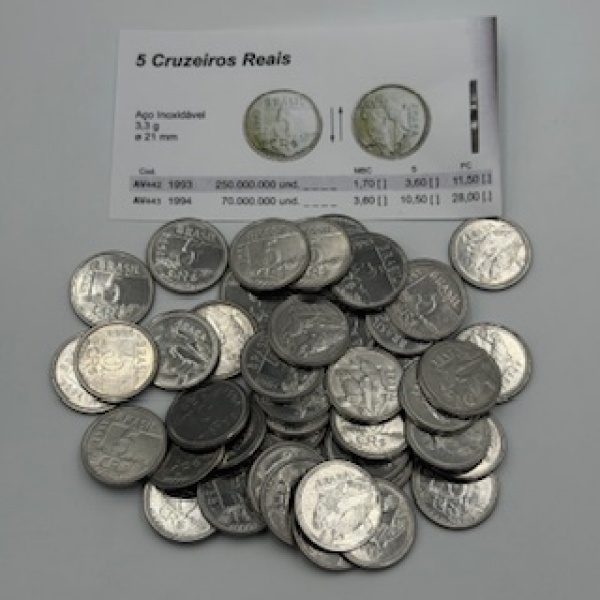 • 50 moedas de 5 cruzeiros reais. Fauna arara. 1993 e 1994. Oferta!!!