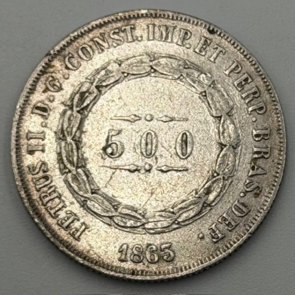 • Moeda 500 réis, 1863. Valor do metal (25/01/25) 102,60 reais