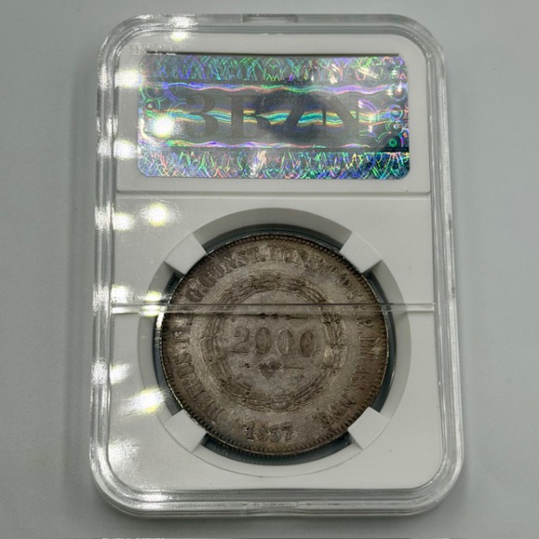 • Moeda 2000 réis, 1857. Prata 916,7. 2° tipo de coroa, 25.5 g - FC