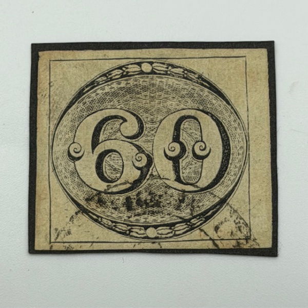 • Selo olho de boi, 60 réis. Perfeito, sem amici. Otima frente. Valor 800 dolares (U.F)