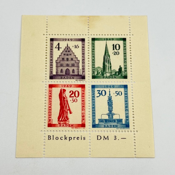 • Alemanha Zona Francesa. Bloco com amarelado fora dos selos, na margem. Michel n° 1A