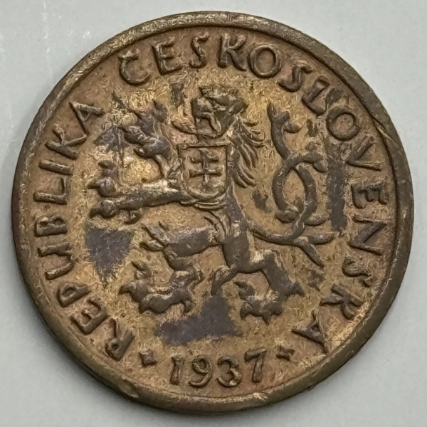 • Moeda Tschechoslovakia República, 10 heller, 1937. Ponte em Praga, Rev: Esc-de-leão. Latão, 1.96 g, KM 3 - SOB