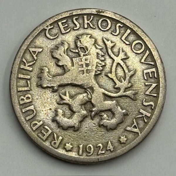 • Moeda Tschechoslovakia República, 1 krone, 1924. Trabalhadora do campo. Rev: Escudo-de-leão. Cuproníquel, 6.66 g - MBC