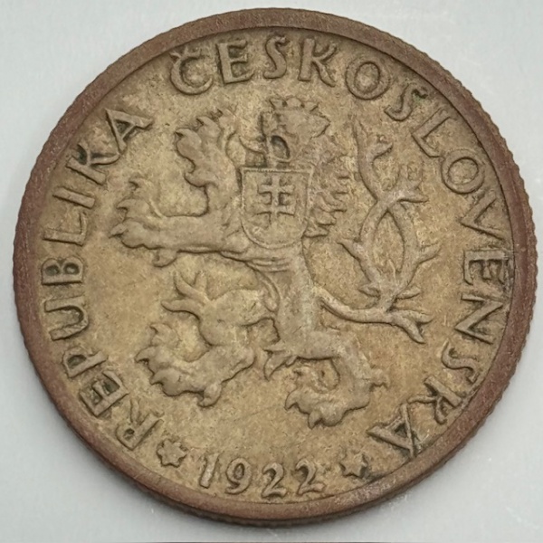 • Moeda Tschechoslovakia República, 1 krone, 1922. Trabalhadora do campo. Rev: Escudo-de-leão. Cuproníquel, 6.66 g - MBC