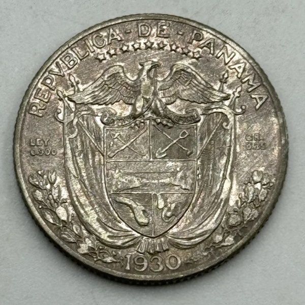 • Moeda Panamá República. 1/4 de Balboa, 1930. Efigie do Vasco Nunes de Balboa. Prata 900, 6.25 g - MBC