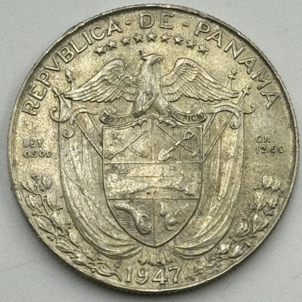 • Moeda Panamá, 1/2 balboa, 1947. Efigie de Vasco Nunes de Balboa. Prata 900, 12.5 g. FC/SOB