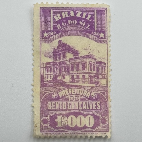 • Selo Fiscal Bento Gonçalves, RS. 1000 Réis. Violeta purpura pálida. Novo. Escasso