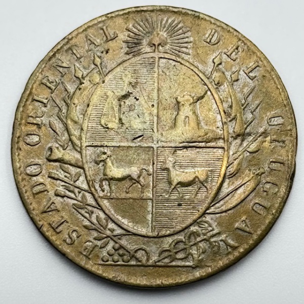 • Moeda Botão de Guaiaca Estado Oriental del Uruguai. Escrita no verso : ... de las Gallinas, 1851. Bronze, 13.56 g, 40 mm de diâmetro - MBC