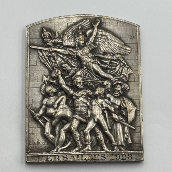 • 18- PLAQUETE TROISIÈME RÉPUBLIQUE-SOCIÉTÉ FRANÇAISE DES MUNITIONS. Bronzr argento (folhado a prata), 52,47 x 68.14 mm, 129.37 g. Anverso: VERSAILLES 1928 (DAPRES RUDE). Reverso: OFERT PAR LA SOCIÉTÉ FRANÇAISE/DES MUNITIONS/JOLITON. Valor € 120,00